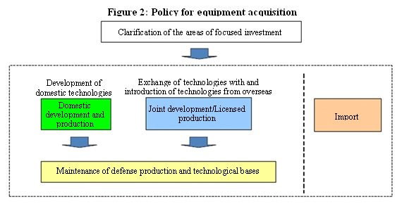 A clear policy for acquiring equipment should be set up by clarifying the areas of focused investment and classifying equipment into groups: 1) Those for which production and technological bases should be maintained in Japan to maintain the ability to autonomously operate equipment; 2) Those developed jointly with other countries or produced under license through technological exchanges with and technological introduction from overseas; and 3) Those imported from overseas (See Figure 2).