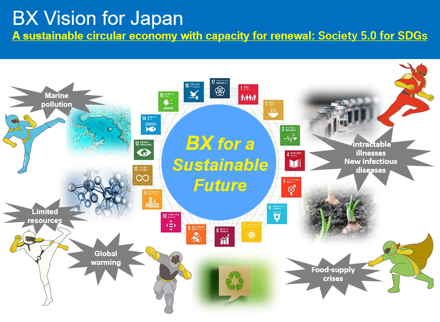 Nonetheless, the real-world implementation of BX presents a great many challenges in terms of regulations and institutions, the environment, and other considerations. In the industrial sphere, the BX process will force some industries, companies, and business divisions to transition away from their existing business models, and dealing with that transition is unlikely to be an easy experience. Even so, the tidal wave of global BX has already reached Japan's shores, just as it did with DX (digital transformation). We should not ignore this tidal wave, but should instead take advantage of it to find solutions to the societal issues this country faces; that is the course of action we must choose as a country that espouses the concept of Society 5.0 for SDGs.