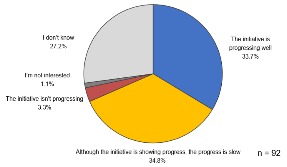 In terms of the AZEC initiative's progress, 34% of respondent companies replied that the initiative was progressing well, while 35% replied that although the initiative was showing progress, the progress was slow. Thus, the results indicated that companies perceive issues and have further expectations regarding prompt advancement of individual projects and implementation of effective measures to that end.