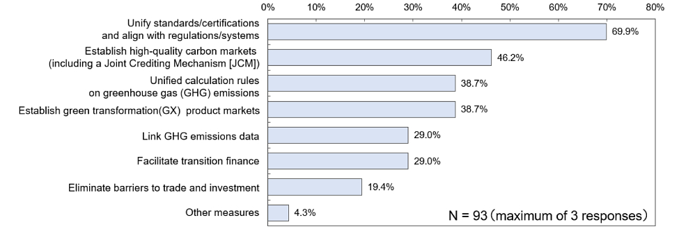 Regarding measures to be prioritized under the AZEC initiative, the most frequent response was "Unify standards/certifications and harmonize regulations/systems" (70%), followed by "Establish high-quality carbon markets (including a Joint Crediting Mechanism [JCM])" (46%), "Visualize greenhouse gas (GHG) emissions" (39%), and "Establish green transformation (GX) product markets" (39%).