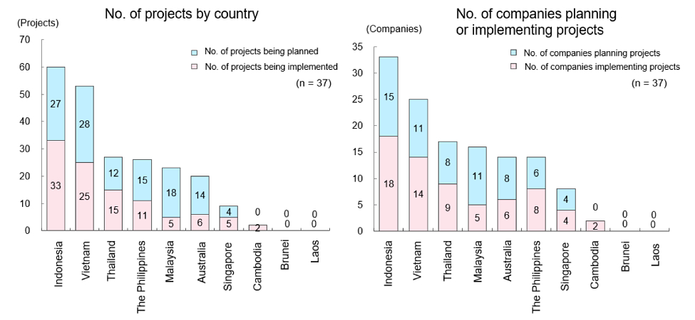 When asked about the promotion of individual decarbonization-related projects at their own companies or group companies, around half of respondents (46%) replied that their company or a group company was planning or implementing a decarbonization-related project. Of these, many individual projects were taking place in Indonesia and Vietnam in particular, and in both these countries individual companies were planning or implementing multiple projects.