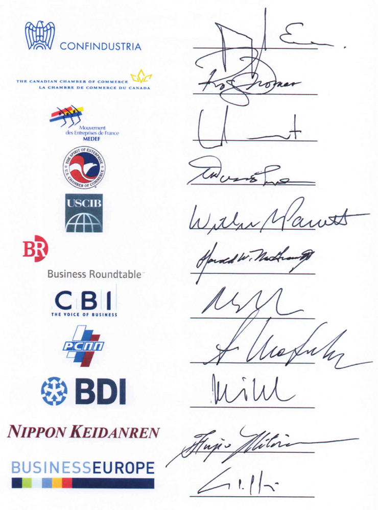 We, the G8 Business Leaders, have gathered on 24th April 2009 in Santa Margherita di Pula, Italy, to address urgent issues concerning the global economic agenda. Our deliberations and recommendations are here reported for consideration by the Heads of State at the forthcoming G8 Summit to be held in July 2009 under the Italian Presidency. Our attention has been focused on three major issues: the response to the financial and economic crisis, free trade and investment and the need to tackle climate change. In addressing these issues, we are aware of our social responsibility in maintaining and creating jobs. A constructive dialogue amongst all stakeholders will help restore confidence. Our deliberations take into account the outcomes of the G8 Business Summit held in Paris on 3-4 December 2008 regarding the financial and economic crisis on which G8 Governments are called to renew their commitment. As a comprehensive process, the G8 Business Summit welcomes the results of the G20 London Summit which represent a strong signal of international cooperation. Enhanced collaboration of the G8 Business community with our partners in emerging economies will be of high importance in the future.