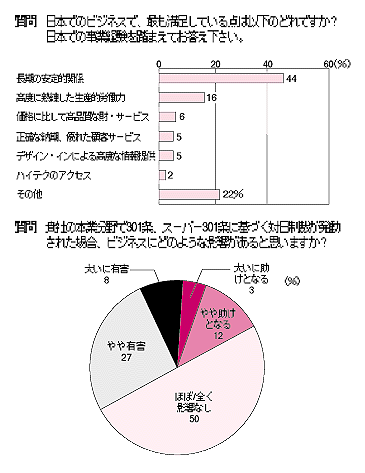 52%の回答者が日本の輸入規制・障壁が日米間の巨額な貿易収支不均衡の主たる原因であると指摘した。また、33%が日本の長期的ビジネス関係に不満を表明する一方、44%が長期の安定的関係にメリットがあると評価した。通商法301条やスーパー301条の発動が自社のビジネスに及ぼす影響については、「助けとなる」との回答はわずかに15%で、有害とする35%の半分以下に止まった。この結果、日本とのビジネスを行なっているアメリカ企業は対日制裁を前提としたアプローチを必ずしも歓迎していないことが明らかとなった。