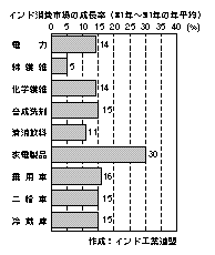 インドには欧米の水準に匹敵する高所得者層が3億人おり、世界でも最大規模の消費市場である。家電、自動車、繊維、電機、電力、消費財などの分野において年率2桁台の成長を続けている。資本財部門は94年4月〜95年2月に22.5%の成長を記録した。