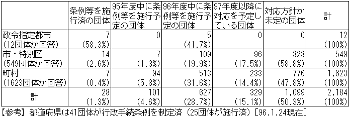 | 条例等を施行済の団体 | 95年度中に条例等を施行予定の団体 | 96年度中に条例等を施行予定の団体 | 97年度以降に対応を予定している団体 | 対応方針が未定の団体 | 計 | |