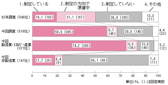 「制定している」と回答した企業数は、92年調査を大幅に上回っており、58.9%に達している。