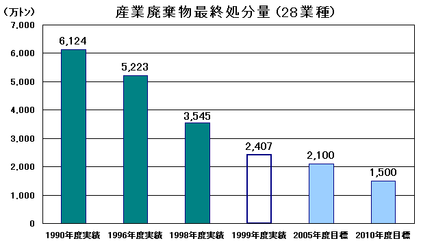 注)28業種:電力、ガス、石油、鉄鋼、化学、セメント、製紙、自動車部品、電機・電子、自動車、建設(住宅を含む)、鉱業、板硝子、ゴム、電線、アルミ、製薬、ビール、伸銅、石炭、精糖、産業機械、造船、鉄道車輌、牛乳・乳製品、製粉、ベアリング、清涼飲料。 このほか、工作機械、貿易、百貨店、損害保険、航空、不動産、通信、鉄道の8業種が産廃最終処分量以外の目標を立て参加。 |