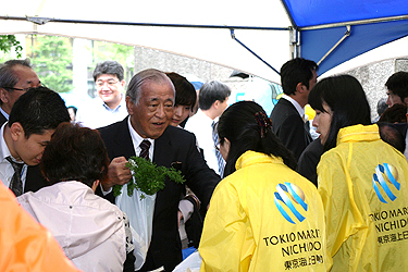 東京海上日動火災保険は12日、東京・丸の内の本社ビル前で、被災地とその周辺地域の農産物等の販売会「食べて応援しよう!東日本野菜フェア」を実施した。第1弾となる今回は茨城県の産品が対象。正面玄関前に設けられたテントでは、野菜や、干し芋などの加工食品が販売されたほか、温かいおやきの実演販売なども行われた。小雨のなか、買い物に訪れた石原邦夫会長(日本経団連教育問題委員会共同委員長)は、「こうした取り組みを通じて、保険本業以外でも積極的に被災地を支援していきたい」とコメント。なお、同社は、引き続き、東北・関東各県を対象としたフェアを行っていく。