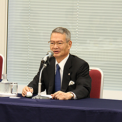冒頭、大橋チーフアドバイザーが「経営者としての“志”〜現在窮乏、将来有望」と題して講話を行った。大橋氏は、経営で最も大切なのは理念であるとして、郷里の偉人である陽明学者の山田方谷(やまだほうこく)の言葉を紹介。特に、「至誠惻怛(しせいそくだつ)=まごころ(至誠)といたみ悲しむ心(惻怛)があれば、物事をうまく運ぶことができる」について、経営者に必要なものと強調した。また、「義を明らかにして利を計らず=正しい理念で経営に当たれば利潤はついてくる」については、同社における「義」は安全と信頼であると指摘。利益を上げたかどうかは問われるが、「義」を優先して「利」を計ることが大切との考え方を示した。また、「深沈厚重(『呻吟語』より)」を人間力を高める概念として紹介した。