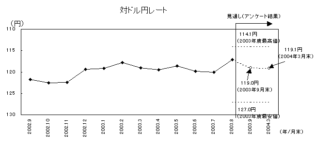 2003年9月末における対ドル円レートの見通しは、平均で約119円となった。2003年度中については、それぞれ平均で、最高値が約114円、最安値が約127円、年度末値(2004年3月末値)が約119円となった。〔回答総数132〕