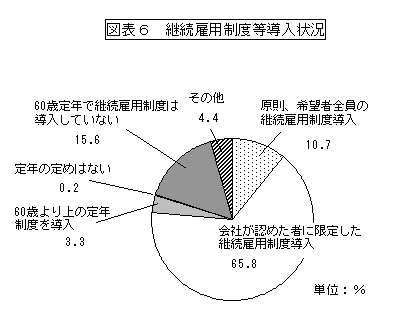 60歳以降も雇用継続するための何らかの制度を持っている企業は8割(80.0%)にものぼっている。このうち、定年は60歳で、60歳を超える継続雇用制度(再雇用制度、勤務延長制度等)を導入し、会社が認めた者に限定している企業は6割強(65.8%)、「原則、希望者全員の継続雇用制度を導入している」企業は1割(10.7%)あった。さらに、「60歳より上の定年制度を導入している」企業は3.3%、「定年の定めはない」企業は0.2%となっている。【図表6】