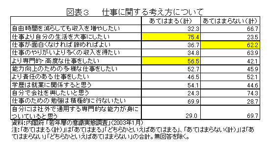 一方で、内閣府の『若年層の意識実態調査』(2003年1月)においては、「仕事が面白くなければ辞めればよい」という考え方について否定する意見が62.2%にのぼっていることから、安易な離職はすべきではないという考え方を持つ若年者も少なくないことがうかがえる。