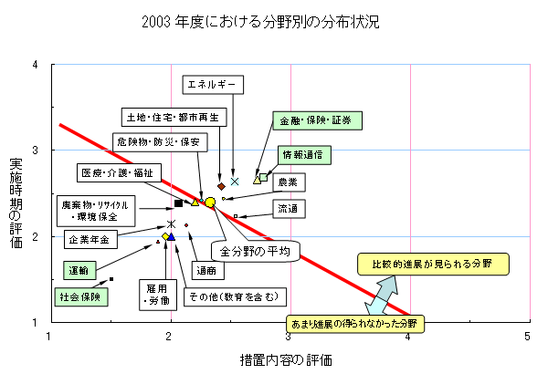 分野ごとの評価について、措置内容、実施時期のそれぞれの平均値を求め、プロットすると以下のようになる。