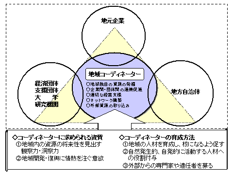 コーディネーターに求められる役割は、個別の企業経営に対して必要な支援の実施、地域内の企業・地方自治体・大学や研究機関等との間のネットワークの構築、地域外の諸機関との関係をつくり、外部からの資源を取り込むための仕組みづくり、などである。