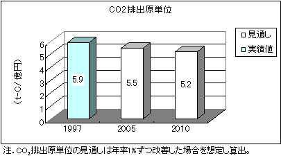 また、1997年度のCO2排出量の実績値は14.1万t-Cである。CO2排出量の見通しは2005年度で13.0〜13.8万t-C、2010年度で12.4〜13.6万t-Cである。自主行動計画を実施しない場合の2010年度における排出量の見通しは14.1〜15.5万t-Cである(事務局注:グラフでは、これら見通しの中間値を示した)。