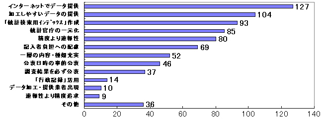 *パソコンで加工できるかたちでのデータ提供や、どの統計にどういう項目が 収録されているかを知らせるツールの必要性を示唆。 |