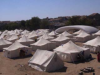 JPF参加NGO「ピースウィンズ・ジャパン」が設置したスクプルのテント避難村。 奥に見えるのが帝人と共同開発したエアバルーンシェルター。 |