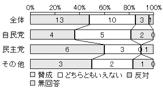 自民党の賛成が4割以下なのに対し、逆に民主党の賛成が6割にのぼっている。