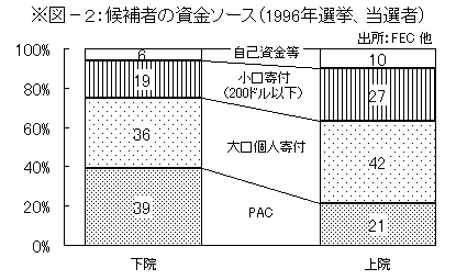 - ソフト・マネー:連邦法の規制の枠外において調達・支出される政治資金で、本来は政党の日常活動費等、選挙には関係のない資金とされたが、実際はいわゆる「政治広告(issue ad)」等の形で選挙に影響を及ぼす資金となっている。(※図−1−(2))