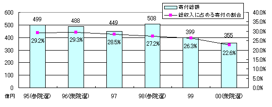 - 寄付総額は、355億円で前年比11.0%減。ピーク時(91年958億円)の37%の水準にまで落ち込んだ。政治団体の総収入に占める寄付の割合は、95年の約3割から2割強に低下。