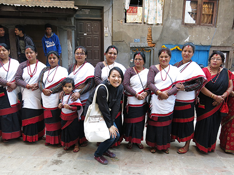 | 調査地にて、ネワールの新年、民族衣装を纏う女性たちとともに |