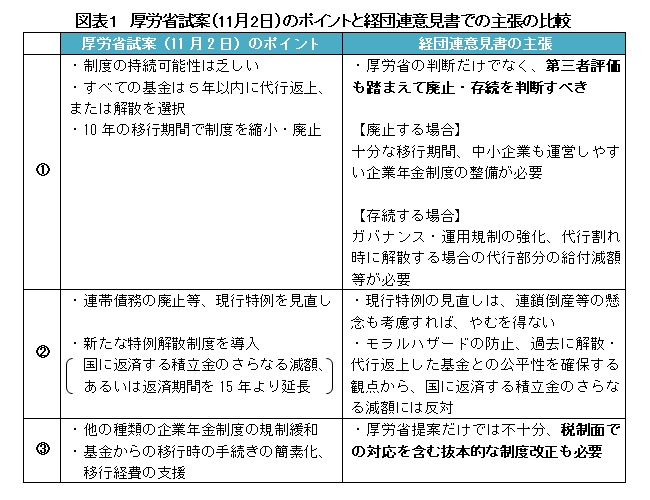 このうち、「代行制度の廃止」については、第三者評価も踏まえたうえで制度の存廃を決定すべきであり、廃止する場合には、十分な移行期間や中小企業も運営しやすい企業年金制度の整備が、存続する場合には、ガバナンス・運用規制の強化や代行割れ時に解散する場合の代行部分の給付減額等の措置が必要である。