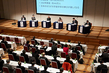 続いて行われたパネルディスカッションでは、鶴氏をモデレーターに、研究会の委員である玉田桂子・福岡大学教授、川口大司・一橋大学准教授、篠崎武久・早稲田大学准教授、さらに峰崎氏、小塩隆士・一橋大学経済研究所教授が加わり、活発な討議が行われた。