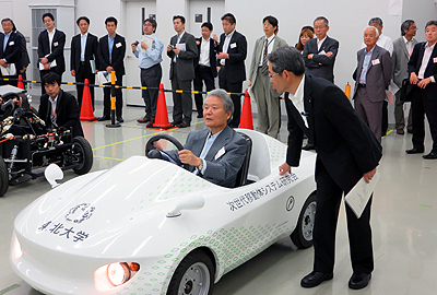なお、懇談会に先立ち、8日には宮城県石巻市、女川町を訪問(前号既報)、9日には多賀城市の「みやぎ復興パーク」を訪問した。同パークでは井口泰孝みやぎ産業振興機構理事長らから開設の経緯について説明を受けるとともに、パーク内の制御システムセキュリティーセンターではインフラ制御システムに対するサイバー攻撃のデモンストレーションを見学、東北大学次世代移動体システム研究会の施設ではケーブルを介さず急速充電が可能な電気自動車の試乗等を体験した。