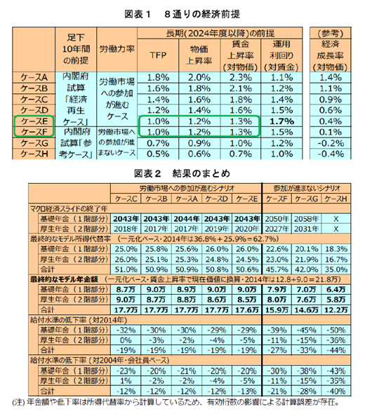 検証に使われた8通りの経済前提(図表1参照)のうち、成長戦略が奏功するケースA~Eはほぼ同じ結果であり、多少の経済好転でも給付削減の終了早期化には限界があることを示している。注目すべきはケースEとFである。この2ケースは、物価や賃金上昇率の前提が同じで労働参加の程度に違いがあるが、将来の給付水準に大きな差が生じている(図表2参照)。