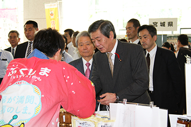 当日は、被災3県(福島・宮城・岩手)の菓子等の名産品、旬のぶどうや野菜、農水産加工品などが販売されたほか、報道写真や観光ポスターも展示された。竹下亘復興大臣、根本匠前復興大臣をはじめ、経団連会員企業の役職員やその家族、近隣の企業・団体の勤務者など約3千人もの人々が来訪、会場は大いに賑わった。