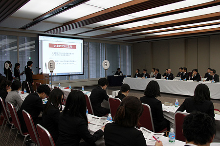 最終講義では、学生が6グループに分かれ、「企業の海外展開や経済の相互依存化が進むなかで、グローバルに人材活用を行うために何が必要なのか」をテーマにプレゼンテーションを行った。企業の具体的な事例を取り上げながら、人事や評価制度における課題、帰任者の活用やサポート環境の整備、教育制度の充実、専門性を評価する体制など企業に向けた提言を行うとともに、グローバル人材として活躍するために今自分たちに必要なアクションや培うべき能力について発表した。企業人講師は学生からの提言一つ一つにコメントしたほか、講義全体を通じての感想を述べ、「グローバル・ビジネスの現状を的確にとらえ、課題を論理的に分析できる力に驚いた。今後もそうした能力を高めつつ学生時代の今しかできないことにも挑戦してほしい」とエールを送った。