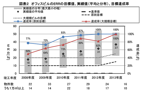 - 2)新築オフィスビルの設計性能については、PAL(年間熱負荷係数)低減率10%以上、ERR(注)15%以上(大型ビルは25%以上)とする。なお、ERRの目標は2013年に5ポイント強化している。