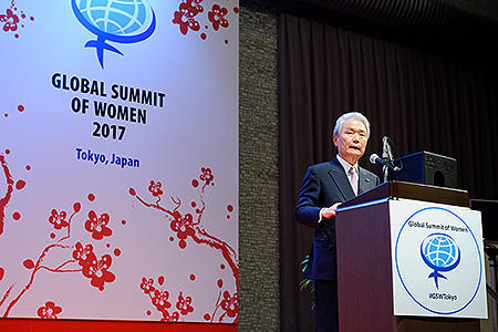 初日に行われた第1セッション「Doing Business with Japan」では、世耕弘成経済産業大臣による講演に続き、経済界を代表して榊原定征会長が登壇。日本経済を取り巻く環境の変化と今後の成長の姿を紹介するとともに、その源泉となる女性活躍について経営トップのコミットメントの重要性や、女性活躍を新たな市場(Emerging Market)ととらえ、経済成長につなげていく必要性などを訴えた。