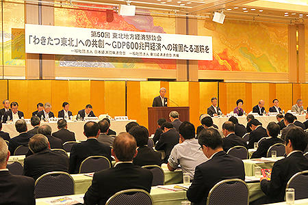 開会あいさつで東経連の海輪会長は、震災復興は「道半ば」であり、また、東北地方は人口減少・少子高齢化が最も速いスピードで進行しているとの認識を示した。そのうえで、東経連の新ビジョンで掲げた「わきたつ東北」の実現に向け、地場産業の活性化と地域の雇用創出などに積極的に取り組むと表明した。