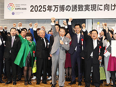 2025日本万国博覧会誘致委員会(榊原定征会長)は12月18日、東京・大手町の経団連会館で、大阪・関西万博の誘致実現に向けた決起集会を開催した。政府、国会議員、経済界、大阪府・大阪市から関係者約400名が一堂に会し、決意を表明した。