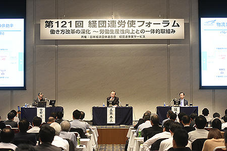 経団連と経団連事業サービスは1月22、23の両日、東京・大手町の経団連会館で「第121回経団連労使フォーラム」を開催した。全国各地から企業経営者や人事・労務担当者ら約280人が参加、「働き方改革の深化~労働生産性向上との一体的取り組み」をテーマに春季労使交渉・協議や労使が抱える重要課題への対応策を探った。