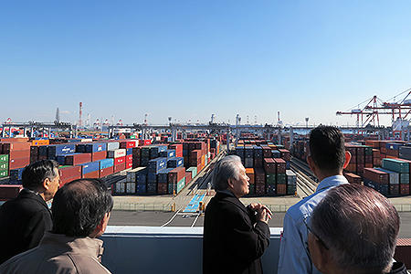 翌23日、一行は豊田会長、山本会長とともに飛島埠頭コンテナターミナル(愛知県海部郡飛島村)を訪問。日本初の自働化コンテナターミナルとして05年に開業した同施設について説明を受けるとともに、ラバータイヤ式ガントリークレーン(RTG)を遠隔操作する作業等を視察した。