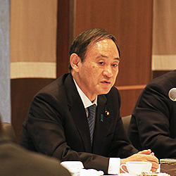 続いてあいさつした菅官房長官は、「安倍政権の最優先課題は経済・財政問題」であり、「アベノミクスによりGDPは60兆円、税収は24兆円、雇用は251万人増加し、有効求人倍率も0.83から1.6に上昇」したことなどを踏まえて、アベノミクスの成果を強調した。そのうえで、「デフレから完全脱却し、経済の好循環を作っていくことが重要である」と述べた。
