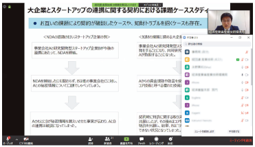 説明を受けてタスクフォース委員等との間で、「こうした取り組みは非常に有益」「NDA段階では今後のプロジェクトの内容が見えていないので、提供する情報の正確性を保証しないことを契約に明記することも必要」「大企業とスタートアップとでは法務のリソースが圧倒的に違う。それを踏まえて交渉のポイントを整理してほしい」「大企業側の優れた取り組み事例を周知することも効果的」などの意見が交わされた。