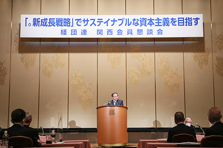 経団連(十倉雅和会長)は7月8日、大阪市内で「関西会員懇談会」を開催した。十倉会長をはじめ審議員会議長、副会長らが出席し、関西地区からオンラインでの視聴も含め会員約400名が参加。「『。新成長戦略』でサステイナブルな資本主義を目指す」を基本テーマに懇談した。