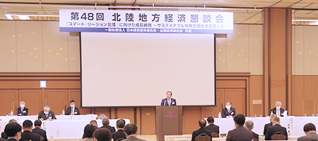 冒頭の開会あいさつで北経連の金井会長が、北経連で取りまとめた「北陸近未来ビジョン」ならびに「第五次中期アクションプラン」に基づき、「北陸のありたい姿」とその実現に向けた取り組み等について言及。意見交換を通じた諸課題の解決に大きな期待を示した。