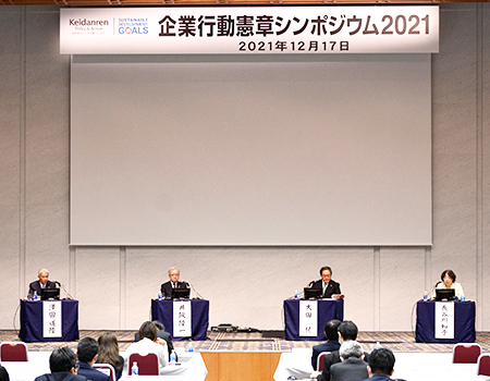 経団連は、2017年11月に改定した「企業行動憲章」の趣旨の理解浸透を目的に「企業行動憲章シンポジウム」を毎年開催している。5回目となる今年度は12月17日に東京・大手町の経団連会館で「持続可能で強靱なサプライチェーンの構築」をテーマに開催し、同時にオンライン配信した。