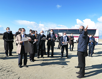 懇談会に先立ち、一行は大阪・関西万博の会場予定地である夢洲を視察。2025年日本国際博覧会協会から、工事の進捗や想定される会場のレイアウト等とともに、交通アクセスをはじめとする開催に向けた準備状況について説明を聴き、現状に対する理解を深めた。