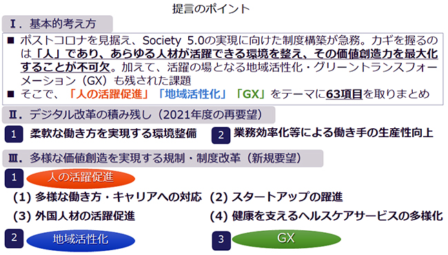 Society 5.0の実現に向けた制度構築が急務となるなか、カギを握るのは「人」であるとして、あらゆる人材が活躍できる環境を整え、その価値創造力を最大化していくために必要な規制・制度改革に焦点を当てた。加えて、地域の活性化やグリーントランスフォーメーション(GX)の推進も盛り込んだ。