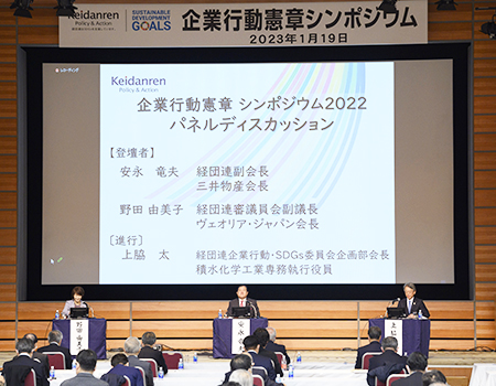 経団連は、「企業行動憲章」の趣旨の理解浸透を目的に「企業行動憲章シンポジウム」を毎年度開催している。6回目となる2022年度は、1月19日、東京・大手町の経団連会館で、「企業行動憲章 実行の手引き」(手引き)を22年12月に改訂(12月15日号掲載)したことを受けて、「サステイナブルな資本主義への転換を加速化する企業経営」をテーマに、対面とオンライン配信のハイブリッド形式で開催した。