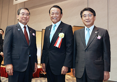 左から十倉会長、麻生副総裁、片野坂フォーラム会長