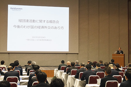 経団連は10月24日、東京・大手町の経団連会館で「経団連の活動に関する報告会・会員交流会」を開催した。久保田政一副会長・事務総長が、今後のわが国の経済外交のあり方に関する経団連の考えや取り組みについて説明した。会員企業等から約200人が参加した。概要は次のとおり。