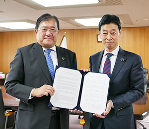 経団連の安永竜夫副会長・日本ブラジル経済委員長は10月25日、西村康稔経済産業大臣を訪問し、7月5、6の両日にブラジルのミナスジェライス州ベロオリゾンテで開催した第24回日本ブラジル経済合同委員会(8月10日号既報)において取りまとめた「日伯経済関係の推進に向けた共同声明」を建議した。