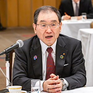 冒頭、十倉会長があいさつ。「成長と分配の好循環」の確立に向けた課題として、GX等の重点分野に対する国内投資の促進や構造的な賃金引上げ、価格転嫁の推進などを挙げた。そのうえで政府に対しては、これらに取り組む企業を後押しする政策の検討、実行に期待を示した。