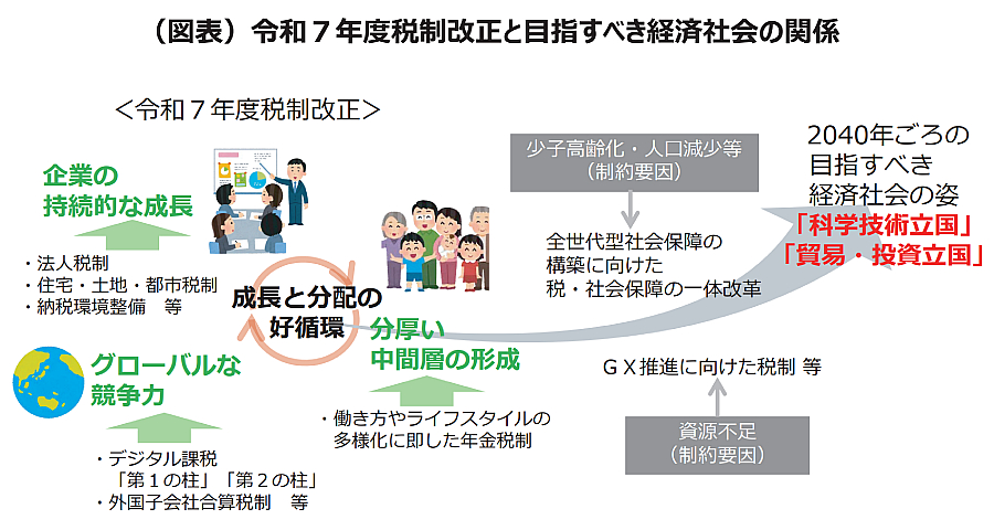 30年ぶりの高水準の賃金引き上げなど、日本経済が歴史的な転換点を迎えるなか、デフレから完全に脱却し、成長型の新たなステージに移行することが重要である。令和7年度税制改正では、企業の持続的な成長を支える基盤として、税制面で求められる対応を着実に実施するとともに、分厚い中間層の形成の一環として、次期年金制度改正に合わせ、働き方やライフスタイルの多様化に即した年金税制を構築すべきである。あわせて、中長期的な視点から、少子高齢化・人口減少など、わが国の制約条件の克服のため、全世代型社会保障の構築に向けた税・社会保障の一体改革などについても検討が求められる(図表参照)。提言の概要は次のとおり。